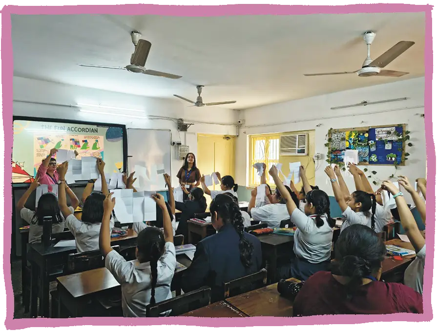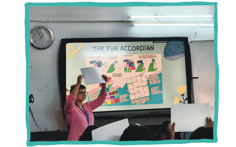 Chirayata Chakrabarty carried out a one and a half hour zine-making workshop, with students from classes 5 and 6, where students brought rudimentary art supplies like paper and colours, and made creative zines (little magazines) with us. They were taught two types of folds of zines. This was a brilliant outlet for children to creatively express their thoughts and opinions on things that are important to them.